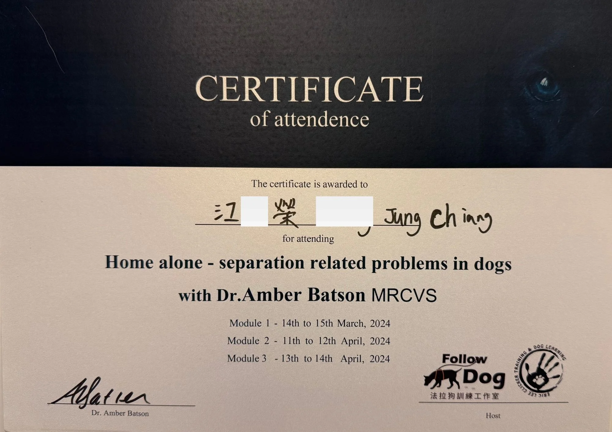 Melvin 「用愛和同理心,一起找回專屬彼此的人犬生活」 自我介紹 從小就在狗狗的陪伴下成長,他們成為了我最早的玩伴,也讓我對狗狗有著深厚的感情。 大學畢業後,遇見了命中註定的愛犬,Taro。 在照顧 Taro 的過程,發現養育幼犬並不如想像中容易,需要具備許多的知識與能力,這讓我接觸到了正向訓練。 並從此踏上了學習的路程,不僅和 Taro 培養出屬於彼此的默契,更萌生了成為訓練師的想法。經過持續不斷地進修,學習了海內外不同的課程,以及許多狗狗的陪伴及練習。 現在,我懷抱著這份熱情,希望能幫助更多的家庭與愛犬建立更和諧的關係。 期待可以參與到每一位飼主及狗狗的生命中, 協助大家找出專屬於彼此的人犬生活。 專長 幼犬教養與社會化 行為改善 鬆繩散步 響片訓練 相關經歷 犬研室 訓練師培訓暨實習課程 CFBI 亞洲訓練師培訓營 2025 True2Life® Ultimate Recall 課程 英國 Dr.Amber Batson 犬分離焦慮課 秋保盃台灣秋田展覽會 若犬牡組第二名 寵物急救 CPR 訓練結業 犬研室 響片訓練課程 Slovenija Dog4motion Academy 的 FUNdamentals K9 體能訓練 犬研室 訓練師培訓暨實習課程 CFBI 亞洲訓練師培訓營 英國Dr.Amber Batson犬分離焦慮課 秋保盃台灣秋田展覽會 若犬牡組第二名 2025 True2Life® Ultimate Recall 課程 寵物急救 CPR 訓練結業 毛爸媽相關心得 比熊 2025-12-25 因為愛,我們選擇正向的幼犬訓練,也成為女兒最穩定的陪伴蓬蓬 因女兒們渴望養一隻狗,一家人迎來了蓬蓬。新手爸媽為給她最好成長起點,邀請專業老師以正向方式引導。課程中彼此建立默契,蓬蓬變得穩定能夠安心地獨處,出門也能冷靜互動。回首當初,爸媽深覺這是最正確的決定。 定點大小便|幼犬訓練|社會化 柯基 2025-12-25 從小打好基礎,邁向幸福的未來 深知過去的養犬觀念已經不合適,爸爸希望從小用正確的方法陪伴小光成長,把握幼犬最珍貴的社會化黃金期。於是,在小光兩個半月時,便請來專業的老師協助,一步步跟隨 Melvin 老師的引導。過程雖然辛苦,但爸爸覺得安心且踏實,因為知道與小光正走在對的道路上。如今,小光在路邊能安靜觀察路過的人,穩定的趴下不躁動;學習速度飛快,並且樂在其中。看著小光快樂成長,爸爸心裡既驕傲,又充滿滿滿的幸福。 幼犬訓練|社會化 行為專欄文章 查看其他訓練師資訊 →