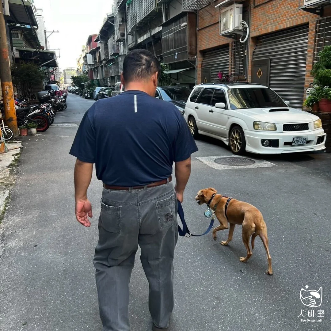 先是換了適合的 H 型的胸背帶,確保尺寸合身不會掙脫,並且尋找家維能夠接受的環境開始練習。從一開始接受到任何人、事、物就想逃走的家維,現在已經可以冷靜地走過少數人和車,甚至是以前最害怕的高壯男生,都能選擇勇敢經過而不是往後逃走。