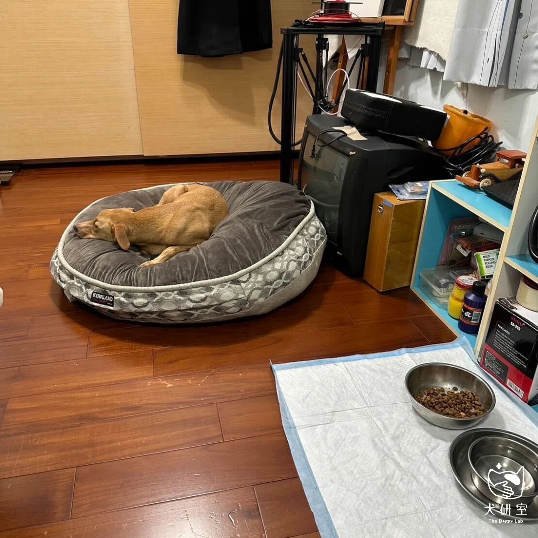 回到家後,也因為害怕男生,連睡覺都沒有辦法安心休息,隨時都保持在警戒的狀態,需要和爸爸保持一定的距離才肯趴下,但時不時又抬起頭來確定爸爸的所在位置。由此觀察,家維的生活不管在戶外還是在家中,時時刻刻都是處於緊繃的狀態,而這樣的生活壓力卻無從釋放,以至於食慾也會跟著下降,這就是我們需要去重視的地方。