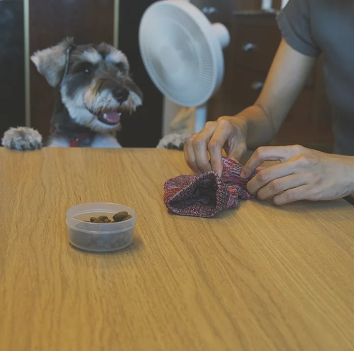 只剩下一隻的長襪子,是用來製作藏食玩具的好選擇,媽媽將零食排排放,將襪子往內捲又往外捲,登愣!一顆小小的藏食球完成,就可以讓莉露玩得不亦樂乎,在努力翻找後享用香噴噴的零食,狗狗也獲得滿滿的成就感。